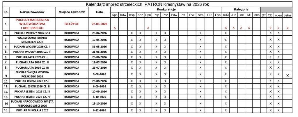 6 stycznia 2026 Małgorzata Dudek Kalendarz zawodów PATRON Krasnystaw 2026 r. Prezentujemy kalendarz imprez strzeleckich organizowanych przez PATRON Krasnystaw w roku 2026.